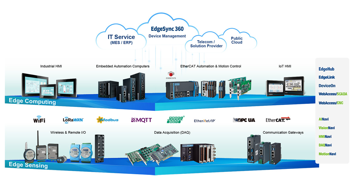 The product lineup includes Industrial PCs for factory automation, HMI Panels for intuitive machine control, SCADA and control systems for process management, IoT gateways for edge connectivity, DAQ and industrial Ethernet solutions for robust communication networks.